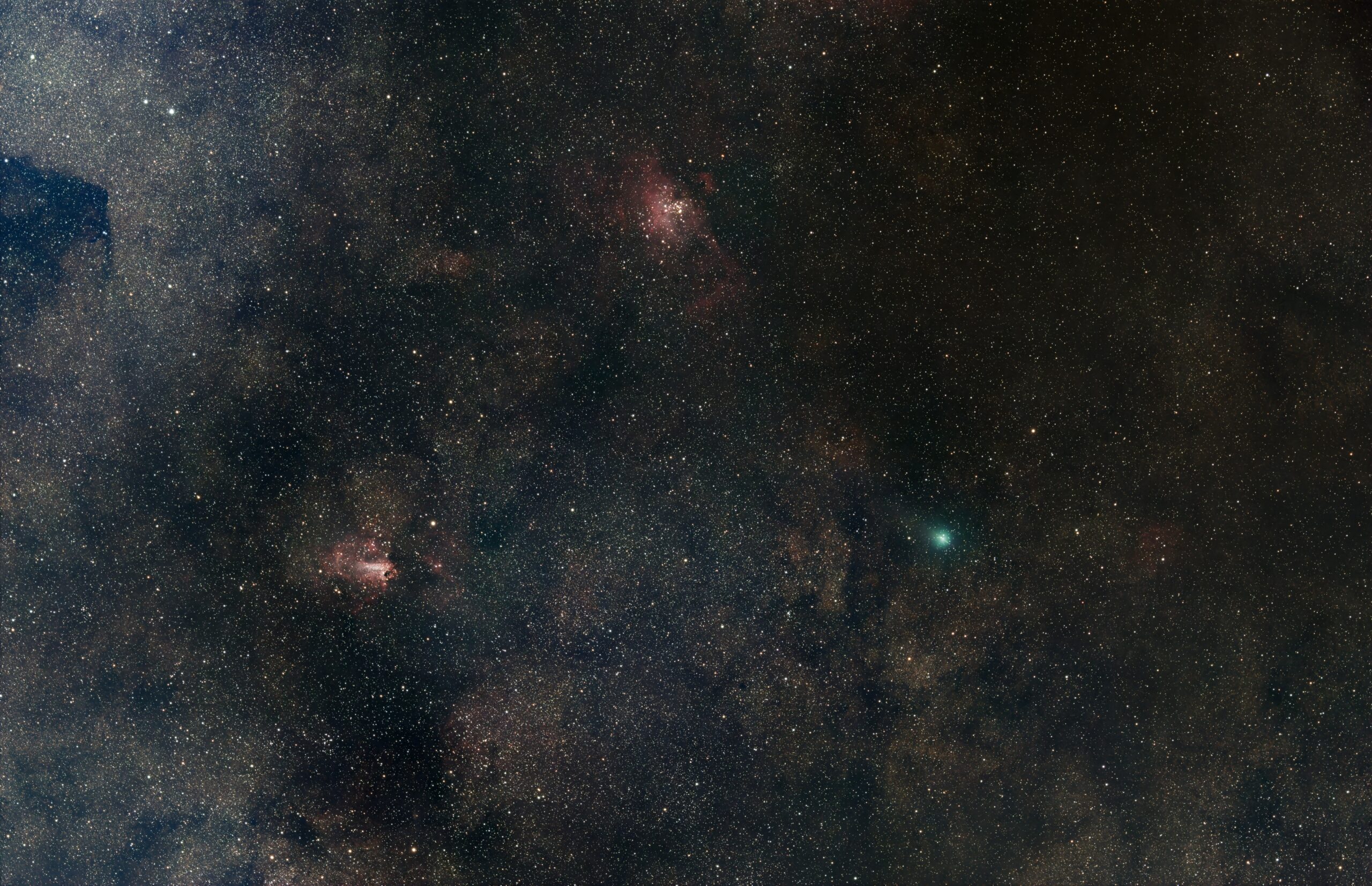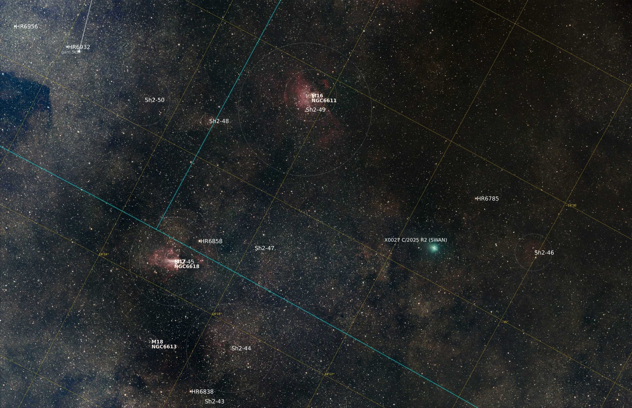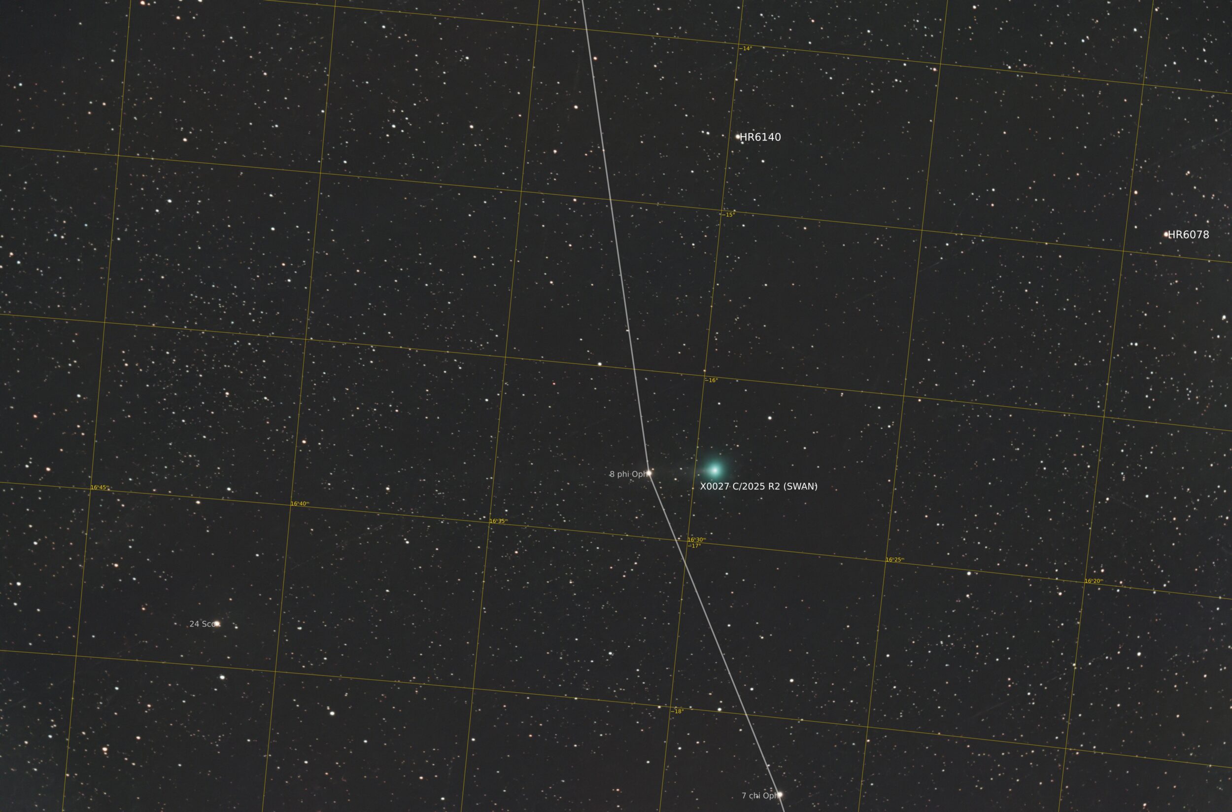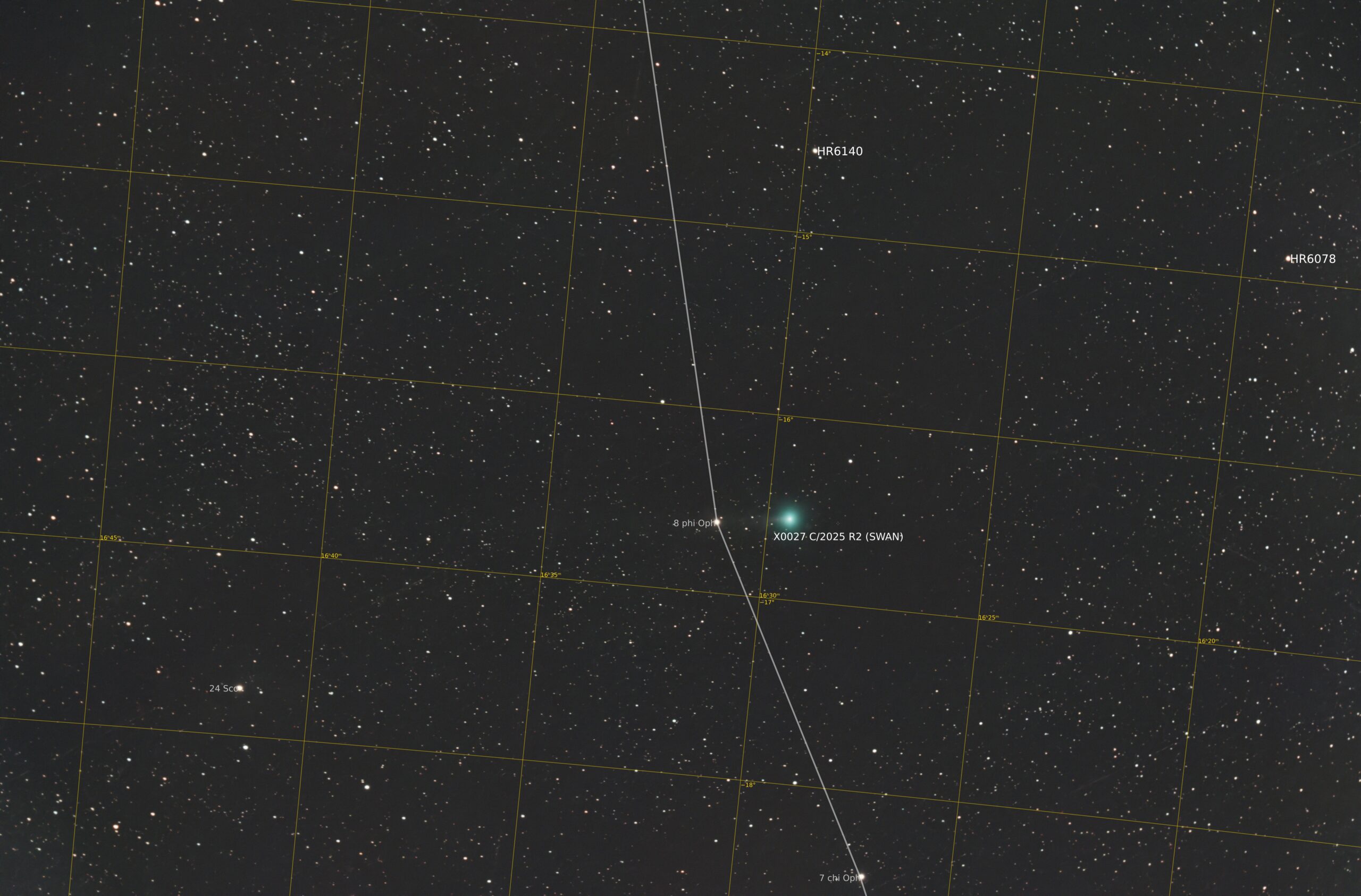 Premières images de C/2025 R2 (Swan) à Cérizols , le 11 octobre 2025. Les satellites sont comme une horde de moustiques… empilement de 20 images de 4s – 25600iso – centrées sur C/2025 R2(SWAN) Cérizols 11/10/2025, Acquisition 61EDPH + EOSRa – focale : 281mm, ouverture: 60mm Time lapse réalisé à partir de 100 images
