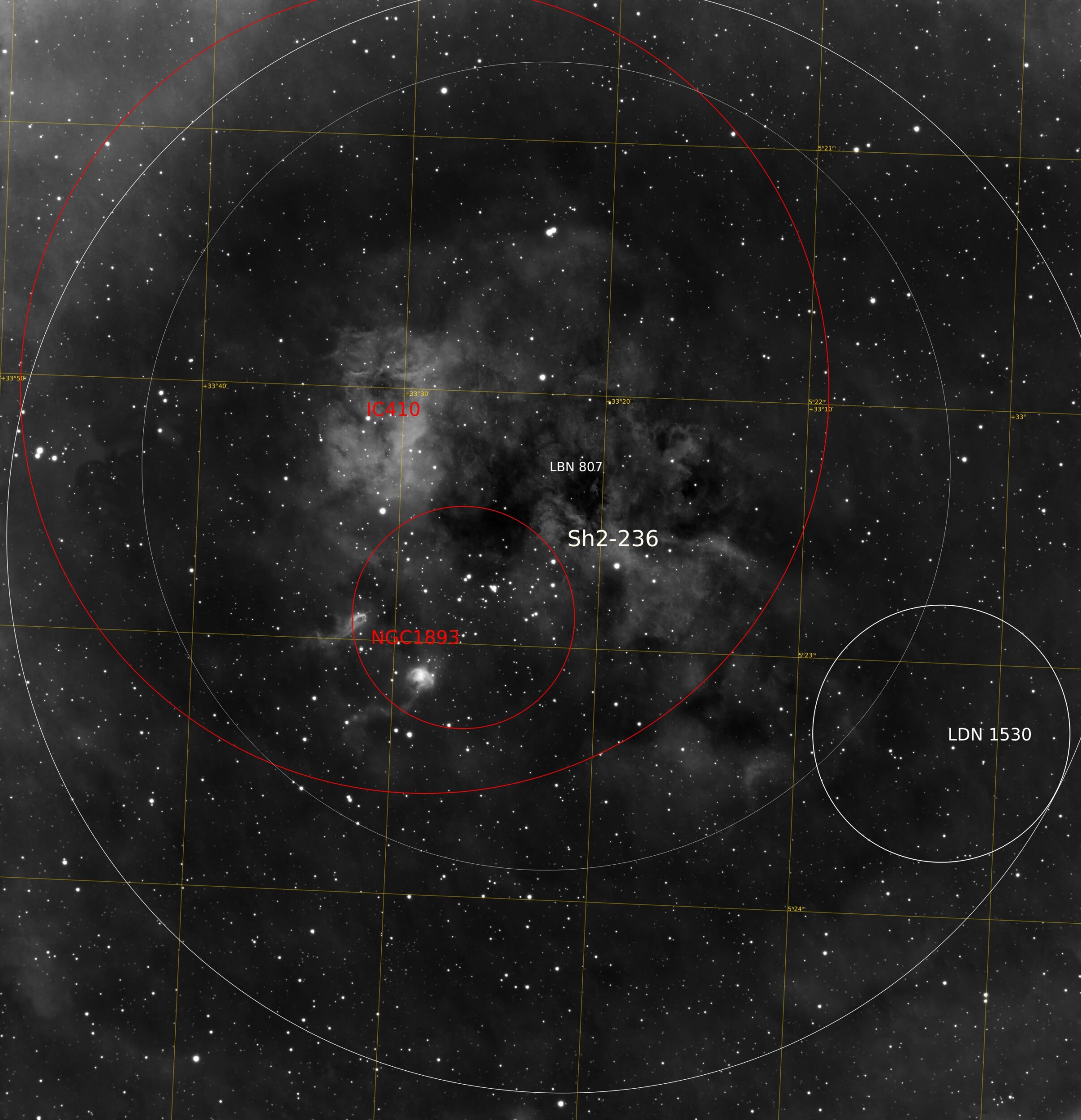 NGC 1893 + nébuleuse en émission IC410 ou Sh2-236 (le Tétard) + IC405 ou Sh2-229 (la flamme) +IC410